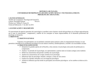 Este documento presenta el programa de la asignatura Psicología General II de la Universidad Metropolitana de Educación Ciencia y Tecnología. El programa describe los objetivos generales y específicos de la asignatura, los contenidos que se cubrirán a lo largo de 6 semanas, y las estrategias didácticas y de evaluación que se utilizarán. Los contenidos incluyen temas como los procesos cognitivos, la personalidad, los estados de conciencia, los métodos de investigación en psicología, y los procesos de