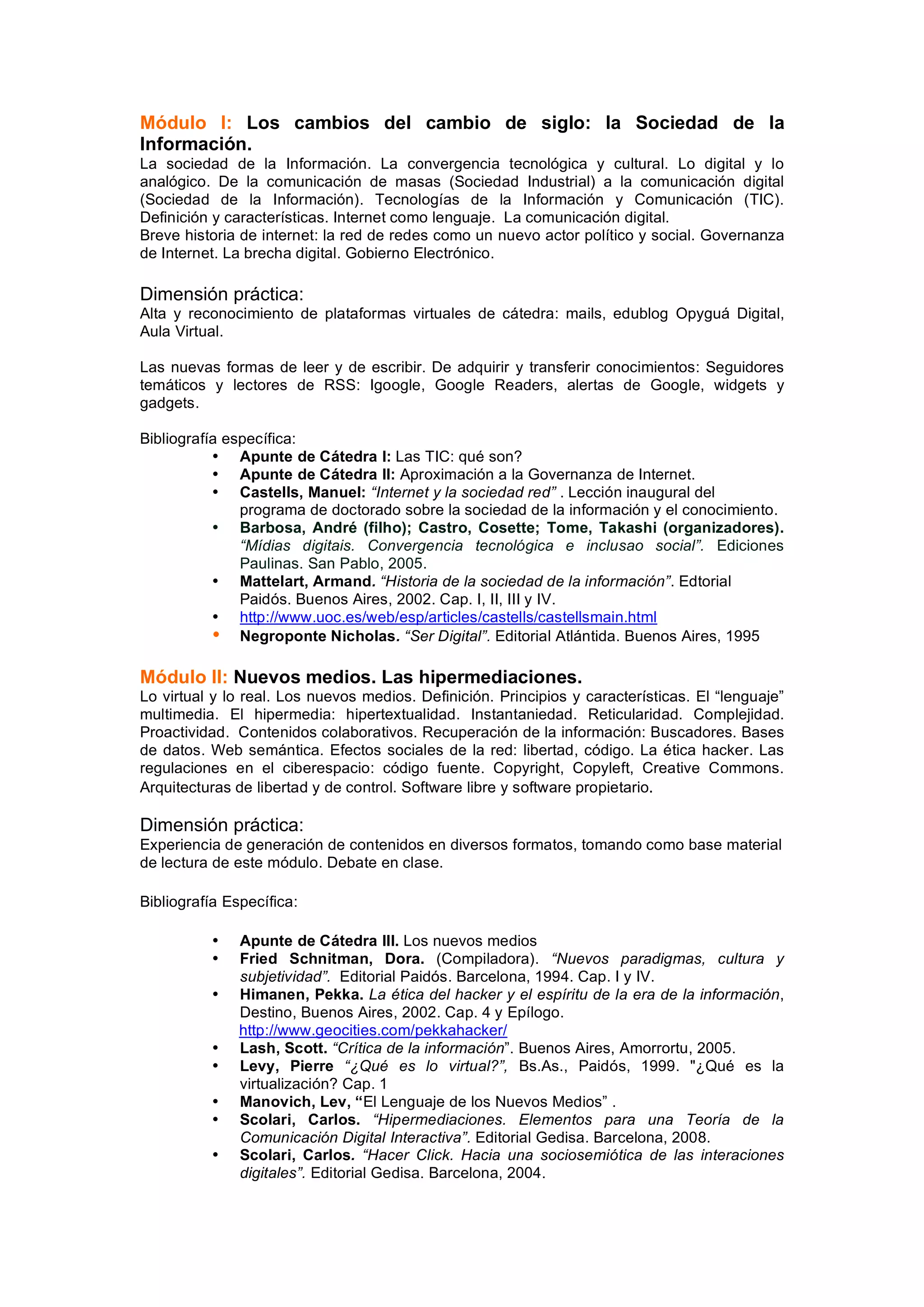 El documento presenta una introducción a 5 módulos sobre la Sociedad de la Información y las nuevas tecnologías digitales. El Módulo I explora los cambios de la era digital incluyendo las TIC, Internet y la brecha digital. El Módulo II cubre los nuevos medios hipermedia, lo virtual y real, y aspectos como la privacidad y el código abierto. El Módulo III examina la Web 2.0, redes sociales, prosumidores y contenido generado por los usuarios. El Módulo IV se enfoca en el period