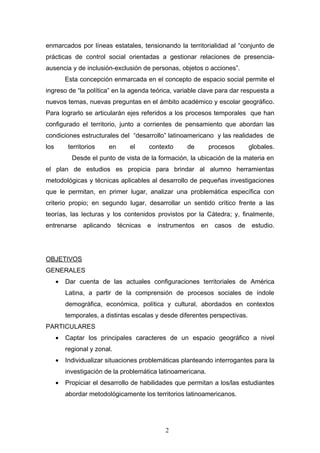 Este documento presenta la fundamentación, objetivos, contenidos y bibliografía de la asignatura "Geografía de América Latina" dictada en la Universidad Nacional de La Pampa. La materia busca analizar las configuraciones territoriales actuales de América Latina a través de procesos sociales, económicos y políticos desde diferentes perspectivas y escalas. Entre los contenidos se encuentran la historia de América Latina, los modelos de desarrollo y políticas territoriales, lo urbano y rural, problemas ambientales y de población, y