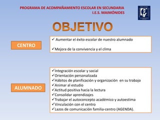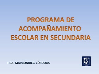 El IES Maimónides ha creado un programa de acompañamiento escolar para mejorar el éxito y la integración de los alumnos con dificultades académicas o de maduración. El programa ofrece refuerzo académico y socio-personal a través de apoyo en las materias, las tareas y las técnicas de estudio. Requiere la implicación de tutores, familias y alumnos a través de reuniones y comunicación constante para mejorar los hábitos y resultados escolares.