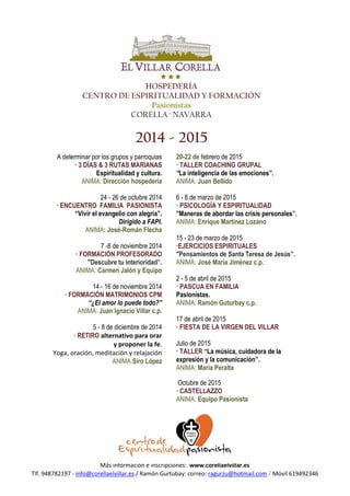 El documento presenta una lista de eventos espirituales y de formación que tendrán lugar en la Hospedería Centro de Espiritualidad y Formación Pasionistas en Corella, Navarra, entre octubre de 2014 y octubre de 2015. Los eventos incluyen retiros, talleres, ejercicios espirituales y encuentros familiares sobre temas como la espiritualidad mariana, la formación del profesorado, la psicología y la espiritualidad, y la música. Cada evento está animado por un líder y proporciona información