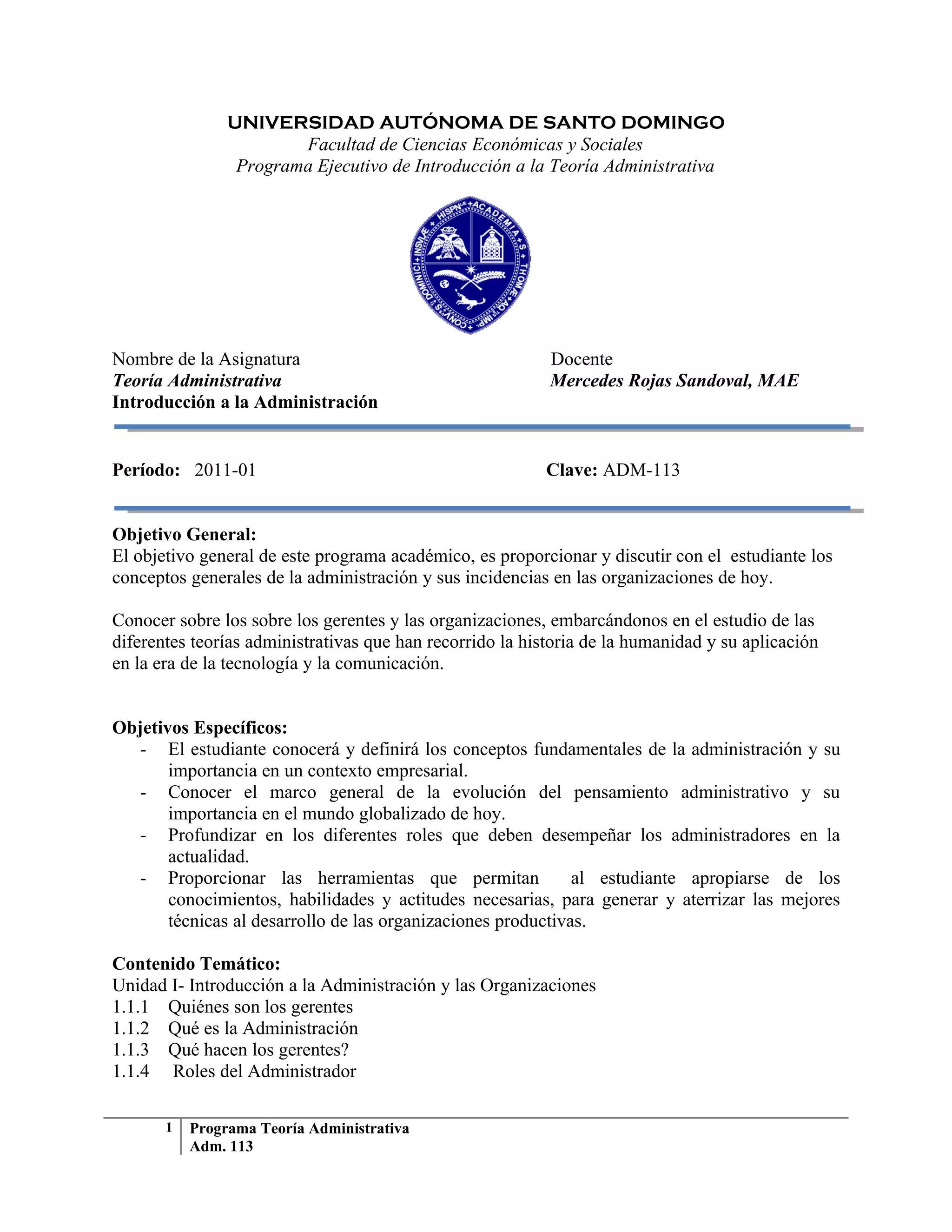 Este documento presenta el programa de la asignatura "Teoría Administrativa" impartida en la Universidad Autónoma de Santo Domingo. El objetivo general es proporcionar conceptos generales de la administración y su impacto en las organizaciones. Los objetivos específicos incluyen que los estudiantes conozcan conceptos fundamentales de la administración, la evolución del pensamiento administrativo, y los roles de los administradores. El contenido se divide en unidades que cubren las principales escuelas del pensamiento administrativo como la administración científica, los