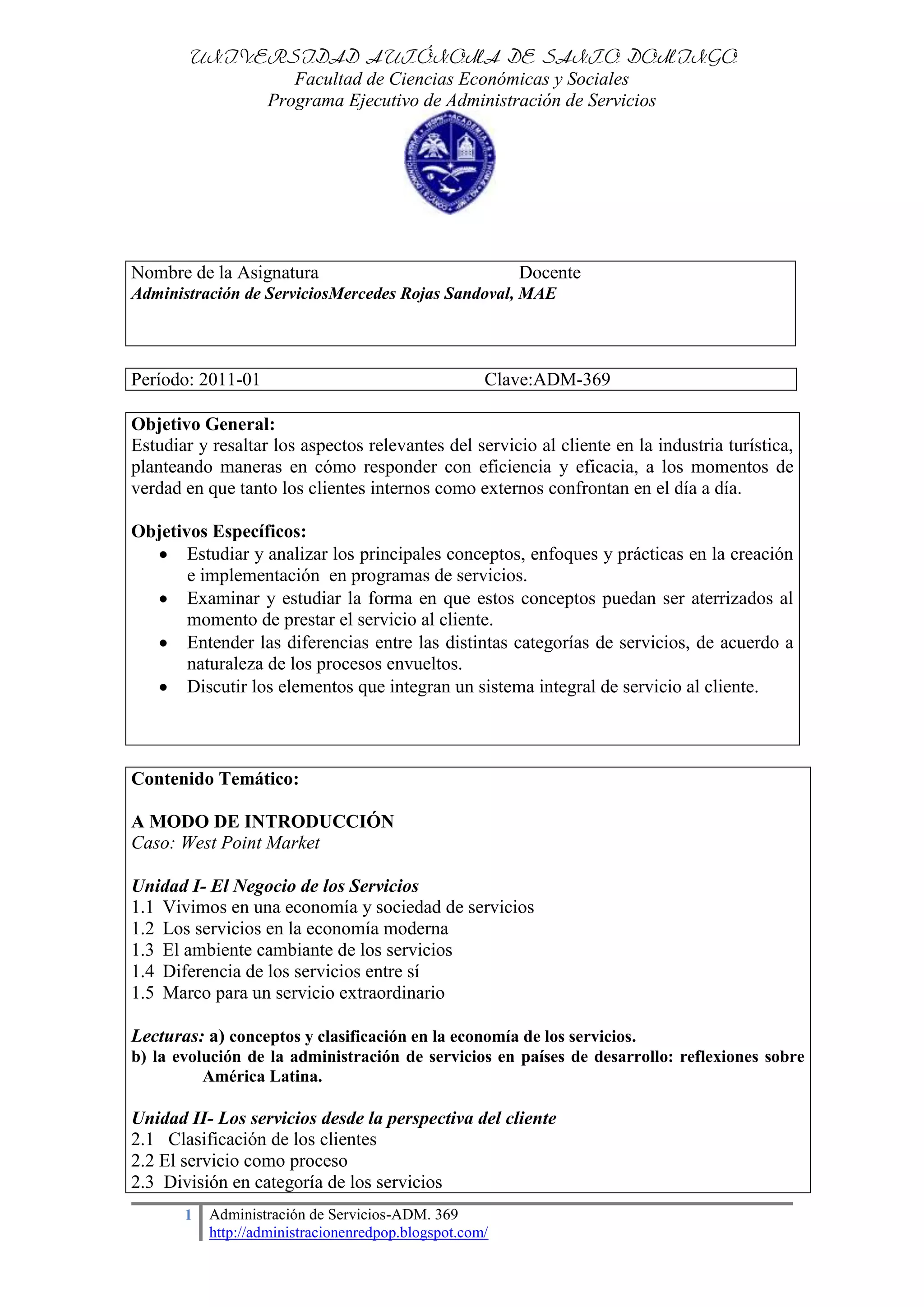Este curso de Administración de Servicios estudiará los aspectos relevantes del servicio al cliente en la industria turística. Los objetivos incluyen analizar conceptos y prácticas de servicios, examinar cómo se aplican al servicio al cliente, y entender las diferencias entre categorías de servicios. El curso cubrirá temas como la calidad del servicio, atención al cliente, participación del cliente, quejas de clientes, talento humano, y tecnología en empresas de servicio. Los estudiantes completarán un trabajo final sobre un tema relacion