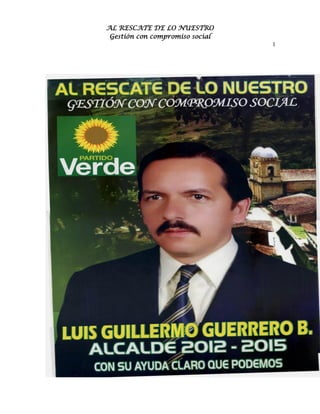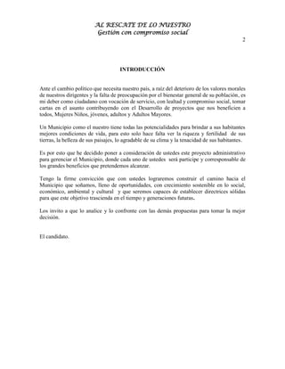 Este documento presenta la propuesta de un candidato para gerenciar el Municipio de Tenza. El candidato busca mejorar la calidad de vida de los habitantes a través de una administración transparente, eficiente y comprometida socialmente. Su propuesta incluye objetivos como mejorar la educación, reactivar la economía local, y establecer programas específicos para niños, jóvenes y adultos mayores, con el fin de lograr un desarrollo social, económico y ambiental sostenible para el Municipio.