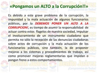 Este documento propone un programa para combatir la corrupción a nivel municipal a través de varias acciones como decretar un Día Municipal contra la Corrupción, mejorar la transparencia en trámites y servicios, fomentar la denuncia ciudadana, y reforzar la educación sobre este tema en escuelas. El objetivo general es establecer mecanismos que generen una participación ciudadana activa y valores de integridad entre servidores públicos.