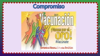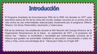El documento describe el programa de inmunizaciones de Panamá. El programa tiene como objetivo controlar enfermedades prevenibles a través de vacunas de manera segura para toda la población. La Semana de Vacunación de las Américas es una iniciativa anual que busca aumentar las tasas de vacunación, especialmente en grupos de alto riesgo como niños, adultos mayores y poblaciones vulnerables. El documento proporciona detalles sobre las metas, actividades y evaluación del programa durante la Semana de Vacunación.