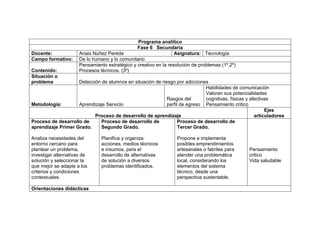 El documento presenta un programa analítico para la asignatura de Tecnología en el campo formativo de lo humano y lo comunitario. El programa aborda la detección de alumnos en situación de riesgo por adicciones a través del aprendizaje servicio. Propone desarrollar habilidades de comunicación, pensamiento crítico y valoración de las propias capacidades. En los diferentes grados, los estudiantes analizarán necesidades del entorno, planificarán acciones de solución a problemas e implementarán emprendimientos para atender problemá