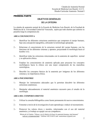 Este documento presenta el diseño curricular de Anatomía Normal I de la Cátedra de Anatomía de la Escuela de Medicina Luis Razetti. Incluye la misión de la cátedra, los objetivos generales, el programa dividido en unidades y temas, la evaluación de los estudiantes y la página web de la cátedra. El objetivo principal es educar a los estudiantes en anatomía humana para que puedan identificar estructuras anatómicas y relacionar la morfología con las funciones de los sistemas y aplicar estos conocim