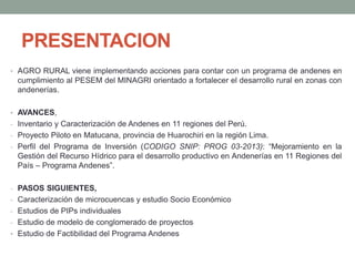 El documento presenta el Programa Andenes de AGRO RURAL, el cual tiene como objetivo mejorar la producción y productividad agrícola en andenes en 11 regiones del Perú. Se han inventariado y caracterizado 340,719 hectáreas de andenes en 738 distritos de 11 regiones. Se ha implementado un proyecto piloto en Matucana que ha mejorado la productividad agrícola en más del 80% y ha reducido la pérdida de agua en un 45%. Adicionalmente, se ha aprobado el perfil del Programa de Inversión "Mejor