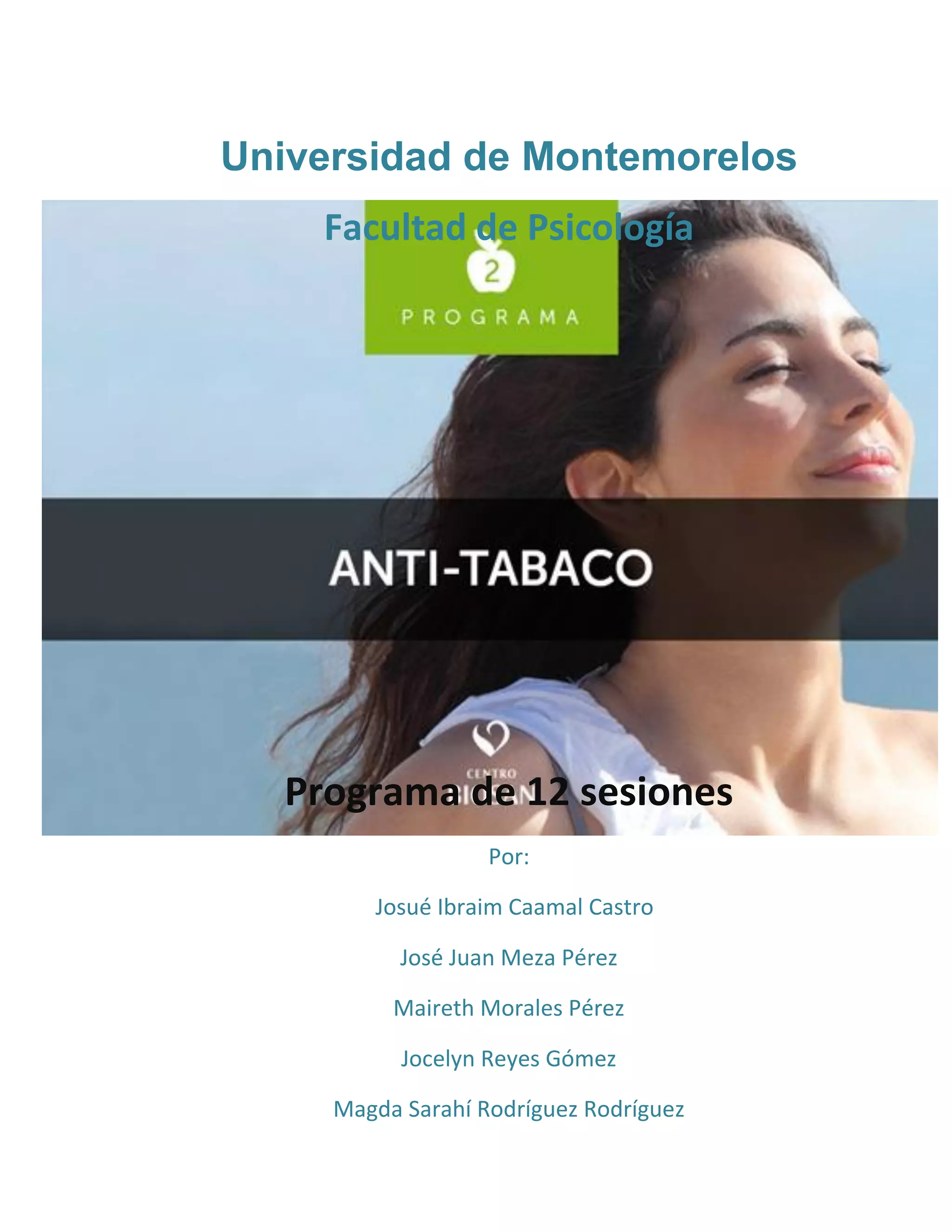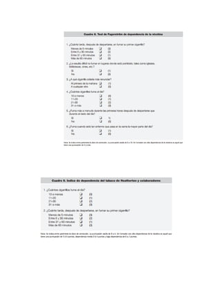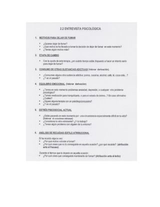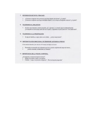 Este documento presenta un programa de 12 sesiones para tratar la dependencia al tabaco. Describe la magnitud del problema del consumo de tabaco a nivel mundial y los costos asociados. Explica que la evaluación inicial del paciente incluye medir el grado de dependencia a la nicotina, evaluar los síntomas de abstinencia, la motivación para dejar de fumar y posibles trastornos psiquiátricos asociados. Las primeras sesiones se enfocan en realizar estas evaluaciones iniciales y establecer el contexto del tratamiento.
