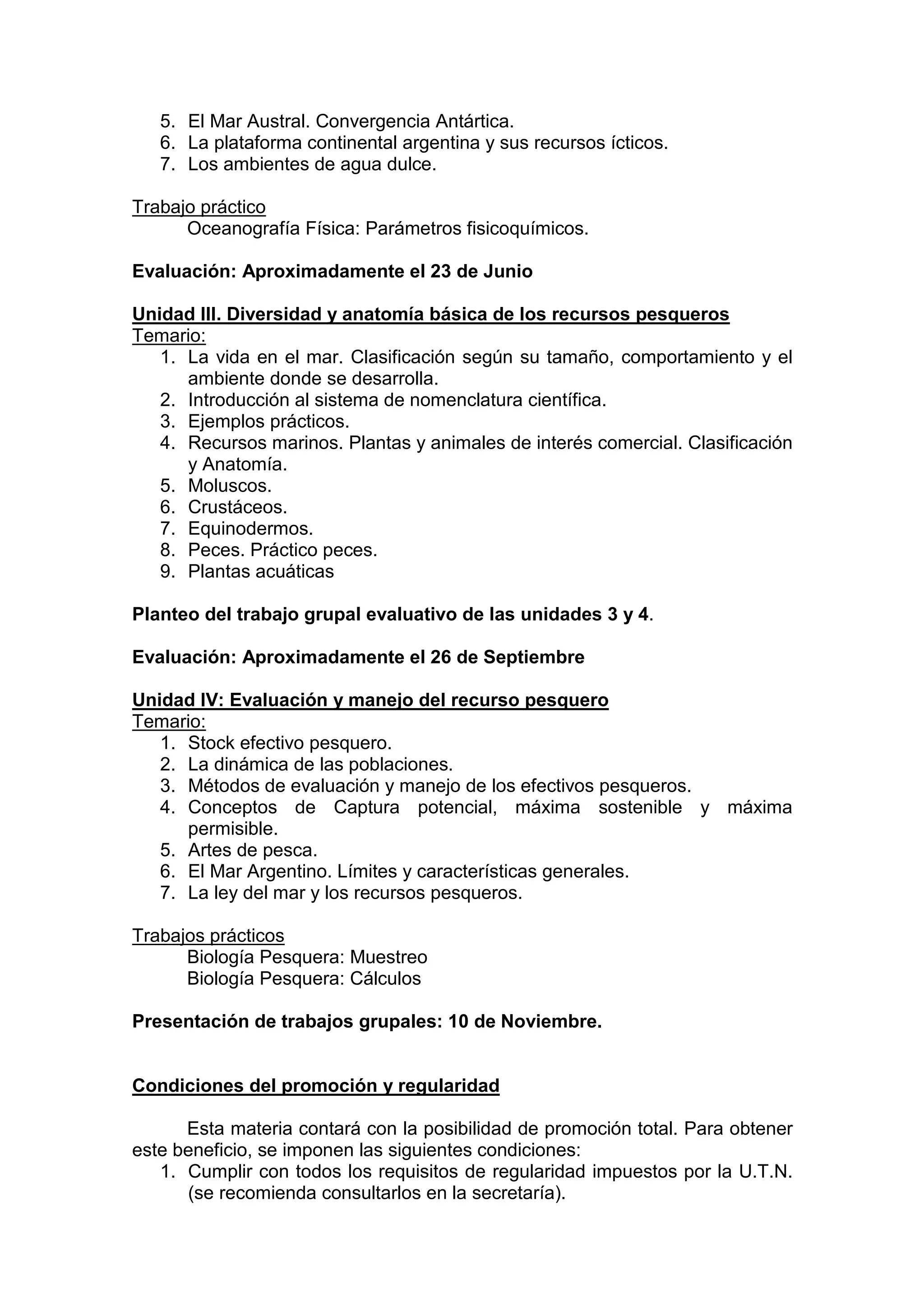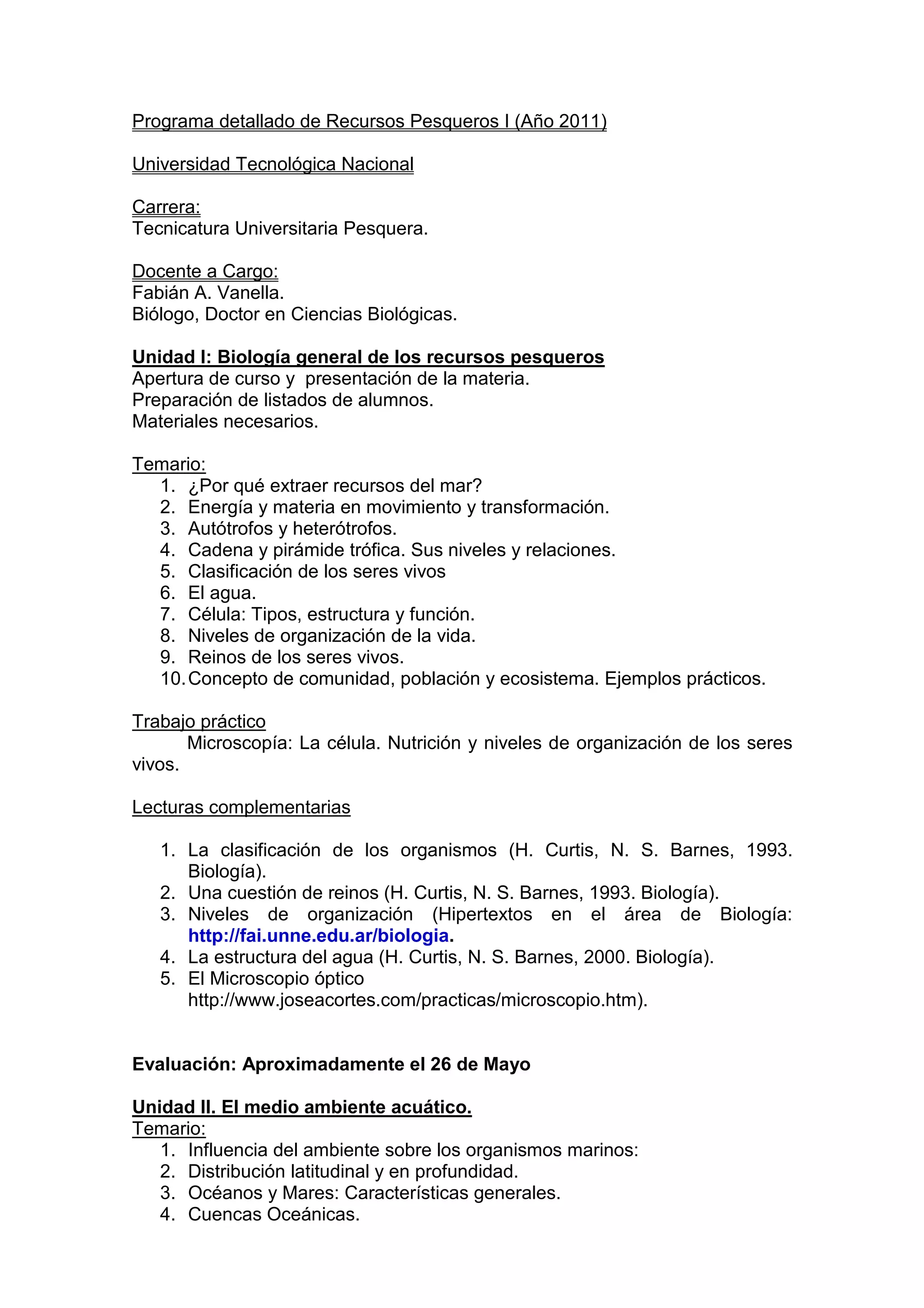Este documento presenta el programa detallado de la asignatura Recursos Pesqueros I dictada en la Universidad Tecnológica Nacional. La materia consta de 4 unidades que abarcan temas de biología general, medio ambiente acuático, diversidad de recursos pesqueros y evaluación del recurso pesquero. Incluye objetivos, temario, trabajos prácticos, lecturas recomendadas y condiciones para la promoción de la materia.