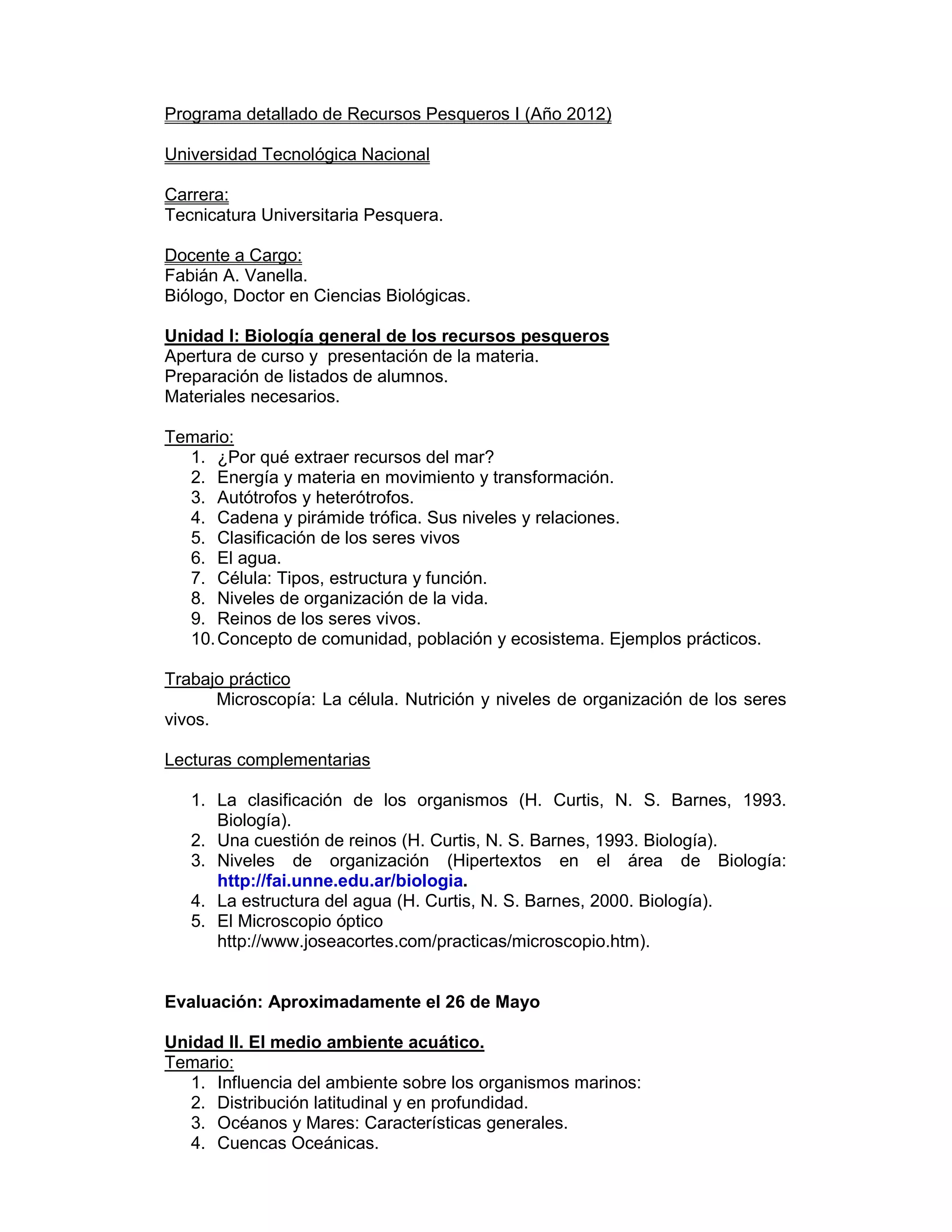 Este documento presenta el programa detallado de la asignatura Recursos Pesqueros I dictada en la Universidad Tecnológica Nacional. La materia consta de 4 unidades que abarcan temas de biología general, medio ambiente acuático, diversidad de recursos pesqueros y evaluación del recurso pesquero. Incluye objetivos, temario, trabajos prácticos, fechas de evaluación y bibliografía recomendada.