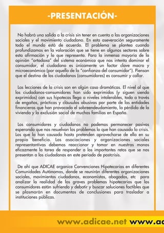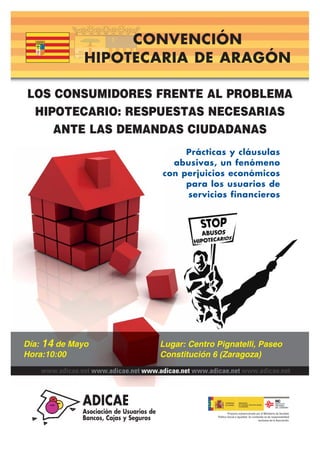 La convención hipotecaria de Aragón analizará los graves problemas que los consumidores están sufriendo debido a las hipotecas, incluyendo sobreendeudamiento, pérdida de viviendas y exclusión social. Se debatirán las prácticas y cláusulas abusivas de las entidades financieras y se buscarán soluciones a través de conclusiones para las instituciones públicas. La convención contará con mesas redondas y paneles con expertos en economía, derecho y organizaciones sociales para analizar la situación actual y reivindicar