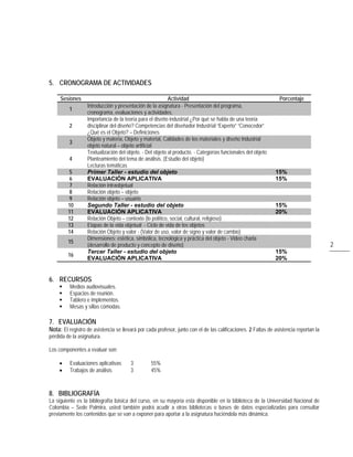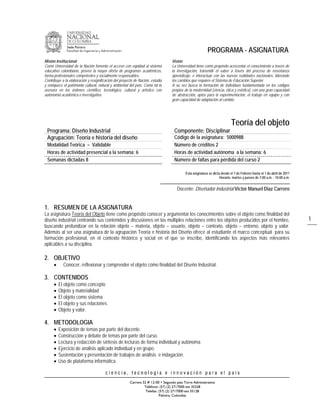 La asignatura Teoría del Objeto tiene como objetivo que los estudiantes conozcan, reflexionen y comprendan el objeto como finalidad del diseño industrial. La asignatura se centra en las relaciones entre los objetos producidos por el hombre y la relación entre el objeto, la materia, el usuario, el contexto y el valor. La metodología incluye exposiciones del docente, debates, lecturas, análisis individuales y grupales y tres talleres de estudio del objeto que representan el 45% de la calificación. Las evaluaciones aplicativas