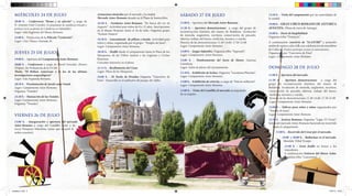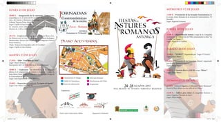 El documento presenta el programa de actividades de las Fiestas de Astures y Romanos que se celebrarán en Astorga del 24 al 28 de julio. Incluye conferencias sobre la historia y cultura romana y astur, representaciones teatrales, demostraciones de oficios romanos, justas, desfiles, mercados y conciertos que tendrán lugar en diversos espacios de la ciudad como la plaza mayor, el museo romano y el campamento astur-romano.