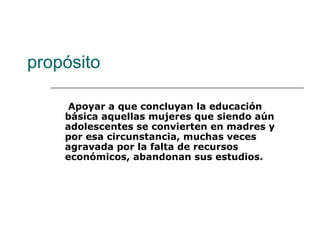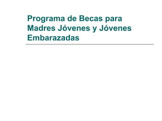 Este documento describe un programa de becas para madres jóvenes y adolescentes embarazadas en México con el objetivo de apoyarlas para que concluyan su educación básica. El programa ofrece becas mensuales de $650 pesos mexicanos a estudiantes de entre 12 y 18 años que estén embarazadas o sean madres solteras de un hijo, con el fin de reducir la deserción escolar y mejorar sus oportunidades de vida.