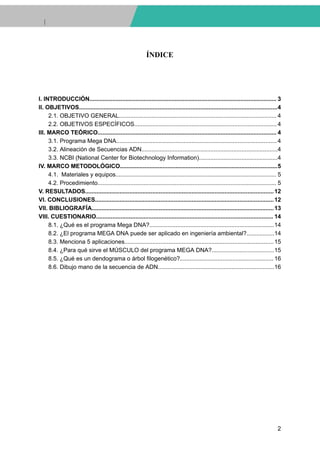 El documento describe un informe sobre el uso del programa bioinformático MEGA DNA para la elaboración de dendrogramas basados en secuencias de ADN, destacando su importancia en la bioinformática y la ingeniería ambiental. Se presentan objetivos, un marco teórico sobre el programa y su aplicación, así como el procedimiento para manejarlo, finalizando con resultados y conclusiones sobre el proceso de alineación y análisis evolutivo. Además, se menciona la utilidad de la herramienta en el análisis de la diversidad genética y el monitoreo de la contaminación en ecosistemas.