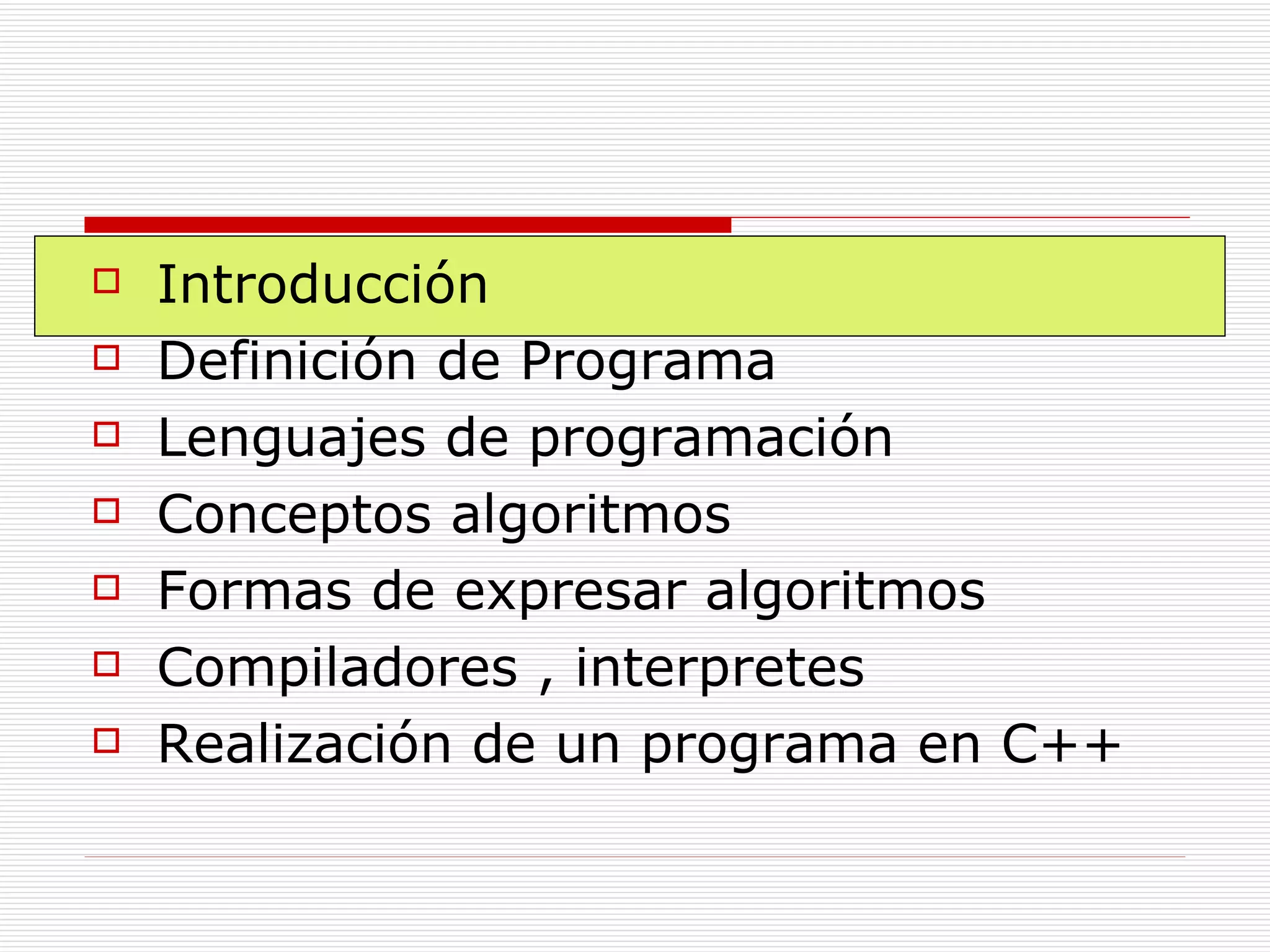 El documento introduce el lenguaje de programación C++. Explica que C++ es un lenguaje de alto nivel que soporta programación orientada a objetos y estructurada. Describe los conceptos básicos de algoritmos, programas, lenguajes de programación, compiladores e intérpretes. Resume los pasos para crear un programa simple en C++.