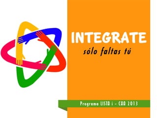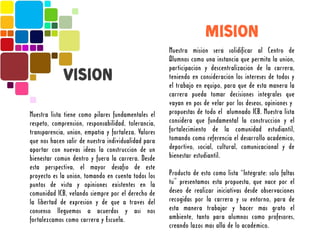 La lista Intégrate: sólo faltas tú propone mejorar la integración estudiantil, el bienestar y la formación académica en la carrera de Ingeniería Civil Bioquímica a través de actividades como tutorías, encuentros con ex alumnos, difusión vocacional, deporte, recreación y comunicación."