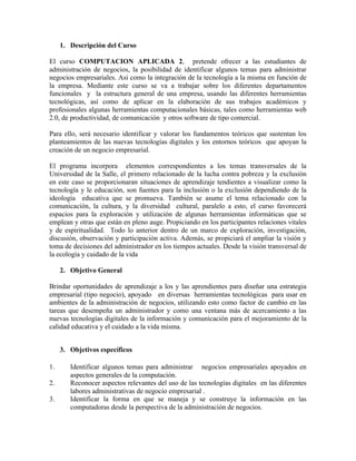 Este documento presenta el programa del curso "Computación Aplicada a los Negocios 2" de la Universidad de la Salle. El curso tiene una duración de 3 créditos y se enfoca en enseñar el uso de herramientas tecnológicas para la administración de negocios. Los contenidos se dividen en 4 módulos que cubren temas como estrategia empresarial, software educativo, herramientas de productividad y la web. El curso utiliza metodologías participativas y la evaluación se basa en proyectos individuales