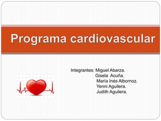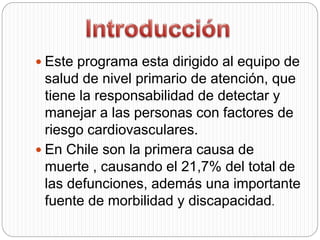 Este programa de salud cardiovascular está dirigido al equipo de salud primaria para detectar y tratar personas con factores de riesgo cardiovascular como diabetes, hipertensión y dislipidemias. El objetivo es disminuir la morbilidad y mortalidad por enfermedades cardiovasculares a través de la prevención y tratamiento oportuno. El programa evalúa factores de riesgo, controla patologías, y permite el acceso a cobertura de salud según el nivel de riesgo cardiovascular de cada paciente.