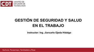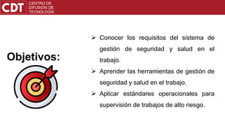 El documento presenta un curso sobre gestión de seguridad y salud en el trabajo, enfocándose en los requisitos del sistema y herramientas de gestión, así como estándares operacionales para supervisar trabajos de alto riesgo. Se detallan normativas nacionales e internacionales relacionadas, como la ley n° 29783 y el reglamento ds 005-2012-tr, que establecen el marco legal para la prevención de riesgos laborales. Además, se enfatiza la importancia de la capacitación y la mejora continua en la cultura de seguridad dentro de las organizaciones.