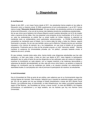 El documento presenta el diagnóstico y los ejes programáticos de la lista de estudiantes independientes "Acción, con-Ciencia y Lucha". Resalta la necesidad de una educación gratuita y de calidad para todos, el acceso irrestricto a la educación superior, la lucha contra la opresión de género y la extensión como un medio para mejorar a la sociedad. El documento también critica las condiciones actuales de la Universidad de Chile y la Facultad de Ciencias Químicas y Farmacéuticas, señal