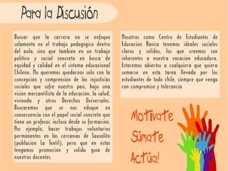 El documento presenta el programa del Centro de Estudiantes de Educación Básica para el año 2013. Busca promover la participación estudiantil a través de cuatro ejes: bienestar, cultura y recreación, participación, y comunicaciones. También propone mejoras académicas como seminarios estudiantiles, un congreso de ciencias de la educación, y una base de datos de apuntes. Finalmente, presenta candidatos para dirigir los departamentos del centro de estudiantes.