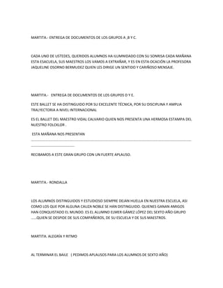El documento describe el programa de una ceremonia de egreso escolar. Incluye la presentación de autoridades, alumnos egresados y grupos musicales. Se reconoce el esfuerzo de los alumnos egresados y se les desea lo mejor en su futuro. Finalmente se agradece la presencia de todos y se da por terminada la ceremonia.