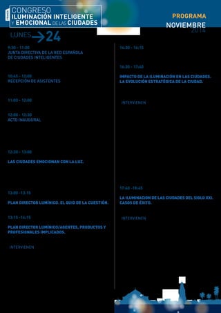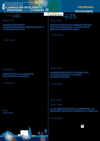 El documento presenta el programa de un congreso sobre iluminación inteligente y emocional de las ciudades que se llevará a cabo en Córdoba. El congreso contará con 10 mesas de debate sobre temas relacionados con la iluminación urbana e inteligente, así como con casos de éxito de diferentes ciudades. También incluirá ponencias, presentaciones y actos de apertura y clausura.