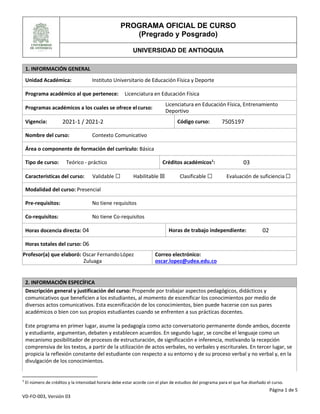 Este documento presenta el programa oficial de un curso de Contexto Comunicativo dictado en la Universidad de Antioquia. El curso busca desarrollar habilidades comunicativas en los estudiantes a través de cuatro unidades que abordan procesos de comunicación, interacción, lenguaje corporal y problemáticas comunicativas en educación física. El curso utiliza metodologías activas y cuenta con varias actividades de evaluación como informes, talleres y la creación de un blog.