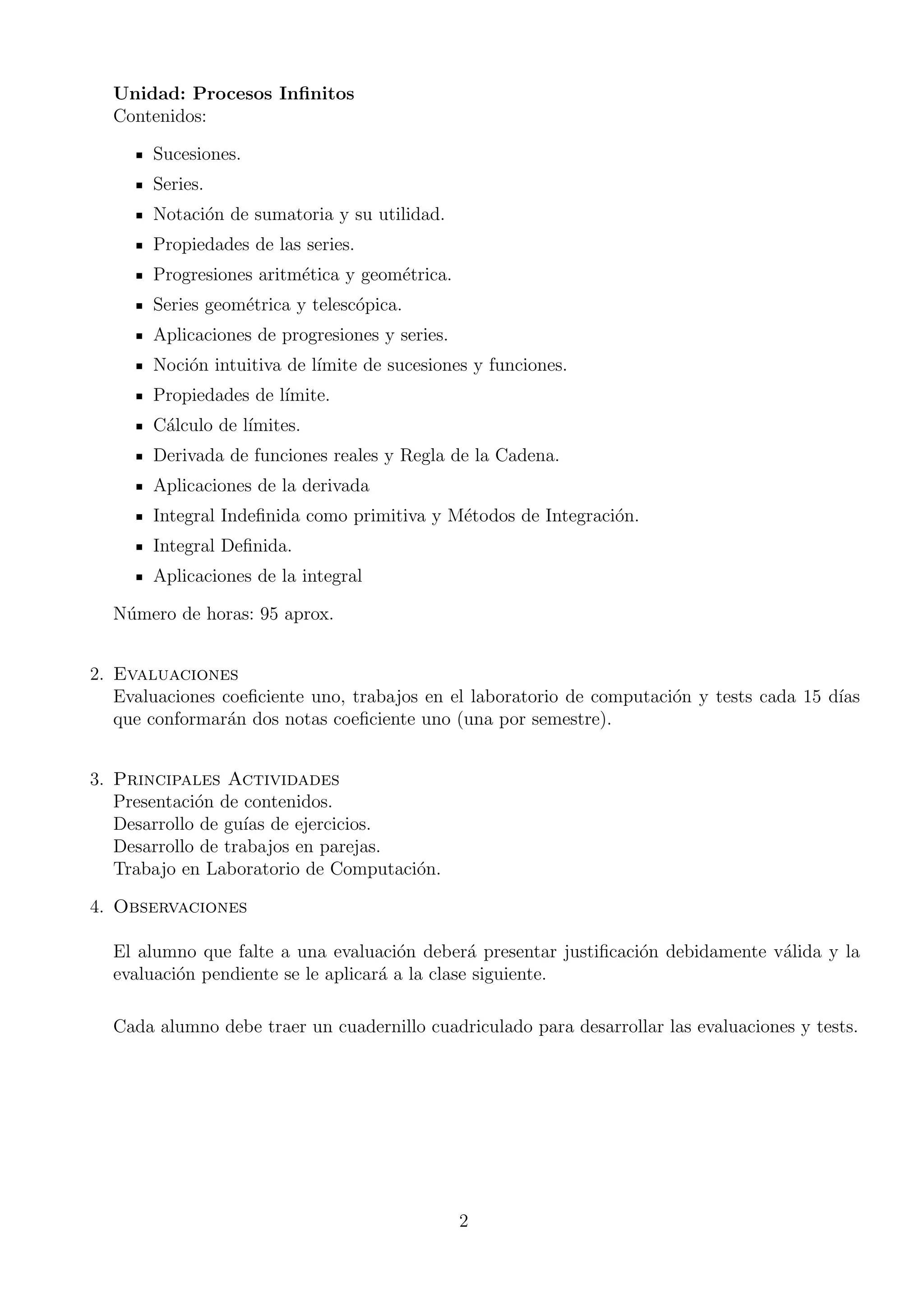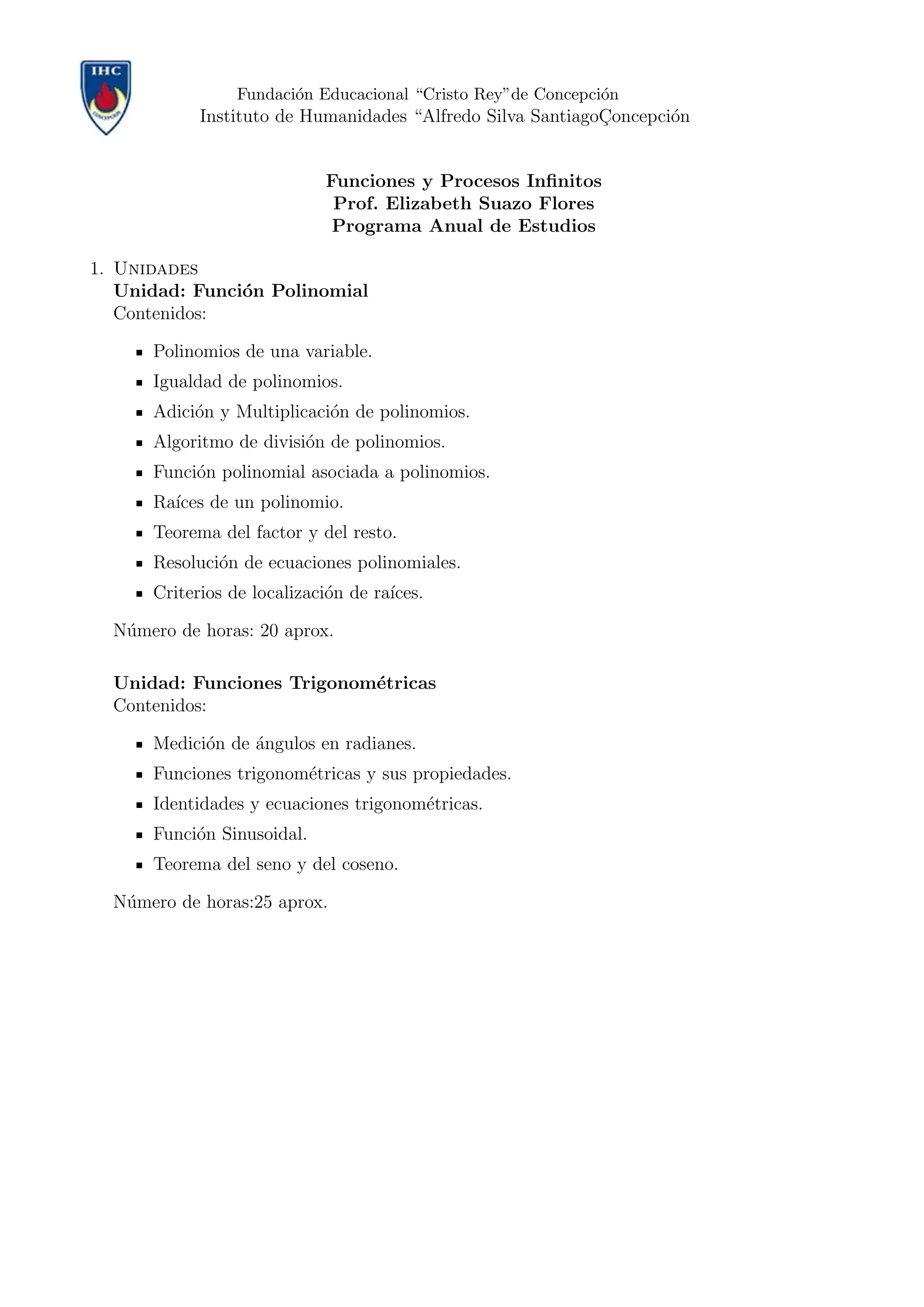 Este documento presenta el programa anual de estudios para el curso de Funciones y Procesos Infinitos. Incluye tres unidades principales sobre funciones polinomiales, funciones trigonométricas y procesos infinitos. Detalla los contenidos, horas y evaluaciones de cada unidad. Las evaluaciones incluyen trabajos prácticos y tests cada 15 días. El profesor utilizará presentaciones, guías de ejercicios y trabajos en parejas para enseñar los contenidos.