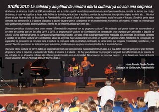 El documento presenta la programación cultural de otoño e invierno en Fuentealbilla y Bormate, incluyendo espectáculos de teatro, cine mudo con música en vivo, zarzuela, música clásica, pop e internacional. Se ofrecen detalles sobre abonos, entradas y precios. El objetivo es ofrecer una amplia oferta cultural de calidad para todos los públicos.