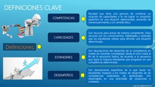 Este documento presenta las definiciones clave y herramientas del programa curricular de educación primaria en Perú. Define competencias, capacidades, estándares y desempeños. Explica que el programa tiene como objetivo orientar los aprendizajes que deben garantizarse en la educación primaria a través del currículo nacional, cubriendo los ciclos educativos, enfoques transversales, planificación y tutoría.