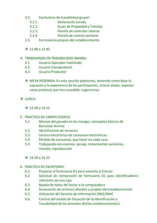 Este documento presenta el programa de un curso sobre trazabilidad animal aplicada que se llevará a cabo el 4 de mayo de 2012 en Paysandú, Uruguay. El curso cubrirá temas como la definición e historia de la trazabilidad animal, herramientas para la trazabilidad, documentación requerida, y prácticas de campo y escritorio para trabajar con la trazabilidad animal. El curso estará dirigido por el Dr. Hugo Estavillo y tendrá lugar en la Asociación Rural de Paysandú.