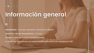El documento describe la Terapia Conductual Dialéctica (DBT), un tratamiento para cambiar conductas no deseadas, emociones, pensamientos y eventos que producen sufrimiento. La DBT enseña nuevas habilidades divididas en cuatro módulos: conciencia plena, efectividad interpersonal, regulación emocional y aceptación radical. Cada módulo se trabaja durante aproximadamente 2-3 meses para aumentar habilidades que mejoran las relaciones interpersonales, control emocional y tolerancia al malestar.