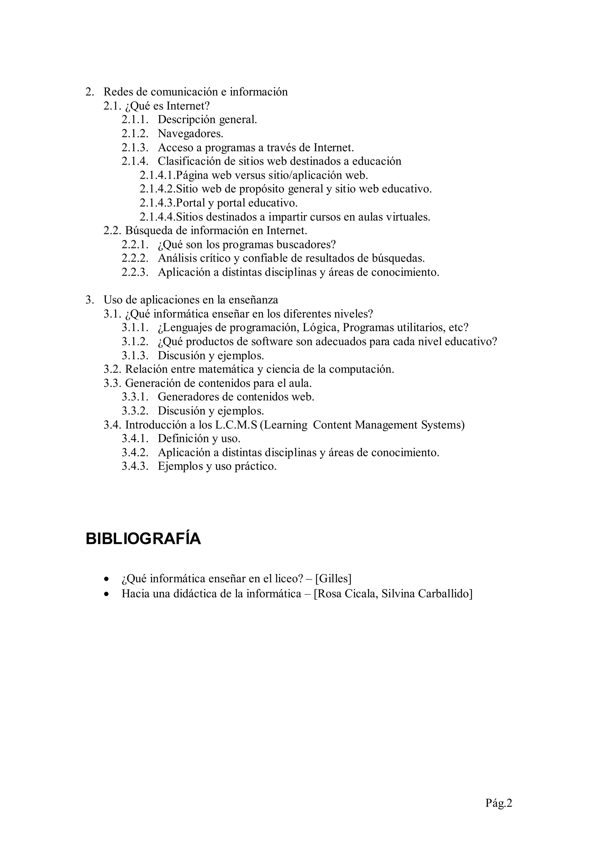 Este documento presenta el plan de estudios de la asignatura Informática para el tercer año de la carrera de Magisterio. El curso tiene una carga horaria de 3 horas semanales y busca acercar a los estudiantes a la informática como disciplina científica e impartir conocimientos generales aplicables a distintas áreas. Se dictará de forma teórico-práctica y evaluará a través de pruebas y trabajos grupales. Los contenidos incluyen conceptos básicos de hardware, software y redes, el uso educativo de Internet y