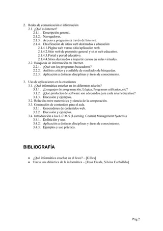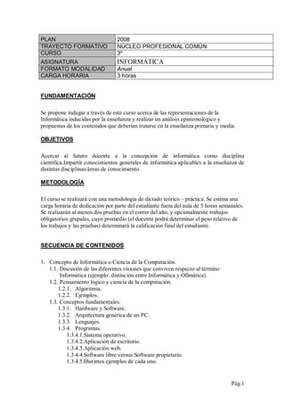 Este documento presenta el plan de estudios de la asignatura Informática para estudiantes de magisterio. El curso dura 3 horas semanales y busca familiarizar a los estudiantes con la informática como disciplina científica y enseñar conocimientos aplicables a otras áreas. La metodología incluye clases teóricas y prácticas, con trabajos grupales opcionales. Los contenidos a cubrir son conceptos básicos de informática, redes e Internet, uso de aplicaciones informáticas en la enseñanza y sistemas de gestión de