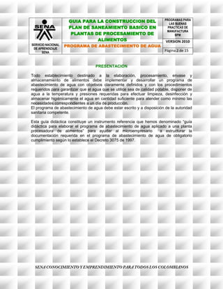 Este documento presenta una guía didáctica para elaborar un programa de abastecimiento de agua aplicado a plantas de procesamiento de alimentos. Explica los componentes clave de un programa de abastecimiento de agua como las fuentes de agua, caracterización del agua, tratamientos de potabilización, usos del agua, almacenamiento y mantenimiento de equipos. El objetivo es ayudar a los microempresarios a estructurar la documentación requerida por la ley para garantizar el suministro y calidad del agua usada en la