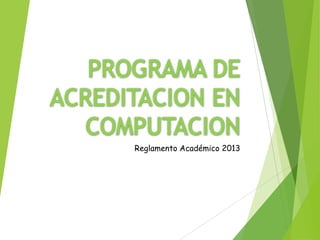 El documento describe el Reglamento Académico 2013 del Programa de Apoyo Curricular (PAC). El PAC es un requisito académico complementario que prepara a los estudiantes de pregrado en herramientas informáticas. Los objetivos del programa son contribuir a la formación integral de los estudiantes, formar profesionales competentes, y brindar preparación con estándares internacionales. El programa se ofrece en modalidades presencial, virtual y b-learning para diferentes ciclos escolares y escuelas.
