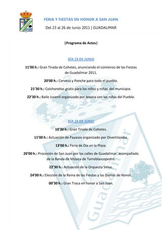 El documento presenta el programa de actos de las fiestas en honor a San Juan que se celebrarán en Guadalimar del 23 al 26 de junio de 2011. Cada día habrá actividades como tirada de cohetes, actuaciones musicales, juegos para niños, procesión, elección de la reina de las fiestas y comidas para los vecinos. El objetivo es celebrar a San Juan con diversión para todos los vecinos del pueblo.