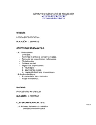 Este documento presenta el plan de estudios de la asignatura Algebra I en el Instituto Universitario de Tecnología "Antonio José de Sucre". La asignatura se compone de tres unidades que cubren lógica proposicional, procesos de inferencia y teoría de conjuntos durante 15 semanas. La unidad I introduce conceptos como proposiciones, tablas de verdad y álgebra de proposiciones. La unidad II cubre procesos de inferencia como demostración condicional y cuantificadores. La unidad III examina conjuntos