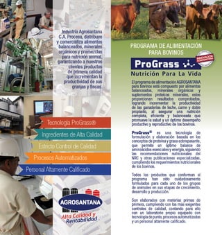 Agrosantana C.A. ofrece un programa integral de alimentación para bovinos que incluye alimentos balanceados, minerales orgánicos y suplementos proteicos, garantizando productos de alta calidad que incrementan la productividad de las granjas. La tecnología Prograss® utilizada en la formulación asegura un equilibrio nutricional óptimo, siguiendo las recomendaciones del NRC, y mejora la salud y el rendimiento productivo de los animales. Esta gama de productos está diseñada para diferentes etapas del crecimiento y producción de los bovinos, contribuyendo a la eficiencia en la producción de carne y leche.