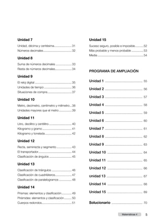 Este documento presenta un plan de mejora para las matemáticas dividido en 15 unidades. La primera unidad cubre números de seis y siete cifras, incluida su descomposición, lectura y escritura. La segunda unidad trata sobre la resta, propiedades conmutativas y sumas combinadas. Las unidades posteriores cubren multiplicación, división, fracciones, geometría y estadística. El documento también incluye un programa de ampliación con más detalles sobre cada unidad.
