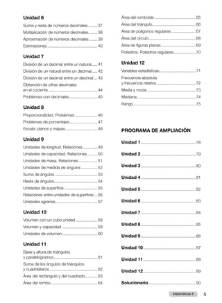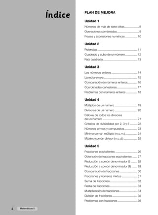 Este documento presenta un plan de mejora para matemáticas que incluye 12 unidades. Cada unidad cubre un tema matemático como números enteros, fracciones, decimales, porcentajes, geometría y estadística. El plan incluye objetivos de aprendizaje, ejercicios y actividades para cada tema. También incluye un programa de ampliación con unidades adicionales para estudiantes avanzados.