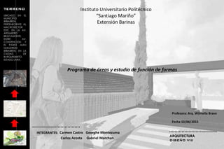 Este documento describe un terreno ubicado en el Municipio Iribarren, perteneciente al macrosector este de Barquisimeto, Estado Lara. El terreno se encuentra localizado en la Avenida Argimiero Bracamonte, entre la Avenida Convención y el Paseo Juan Guillermo Iribarren. El documento también incluye varios diagramas de zonificación y distribución de un centro asistencial de quemados en 3 pisos.