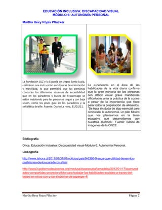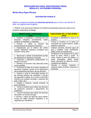 Este documento presenta un programa para enseñar autonomía personal a un niño de 10 años con ceguera total congénita. El programa incluye enseñar orientación y movilidad, habilidades de la vida diaria como vestirse, bañarse, comer y limpiar, y habilidades para viajar en transporte público de manera independiente. El objetivo es conquistar la autonomía a través de la enseñanza de estas habilidades esenciales.