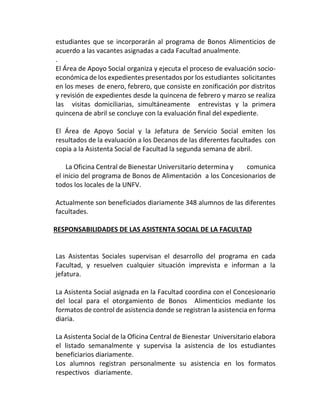 El documento describe el Programa de Bonos Alimenticios de la Universidad Nacional Federico Villarreal. El programa provee comidas diarias a estudiantes de bajos recursos económicos durante el año académico. Los estudiantes regulares de primer a quinto año pueden aplicar y son seleccionados para recibir un número determinado de bonos alimenticios basado en su situación socioeconómica y horario de clases. Actualmente, el programa beneficia a 348 estudiantes a diario.