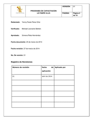 Este documento presenta el programa de capacitación de Le Panpe S.A.S. para el año 2014. Explica los objetivos, alcance, proceso y necesidades de capacitación. Define términos clave como capacitación, competencia, cursos básicos y avanzados, entre otros. Describe la visión y objetivos de la capacitación de la empresa.