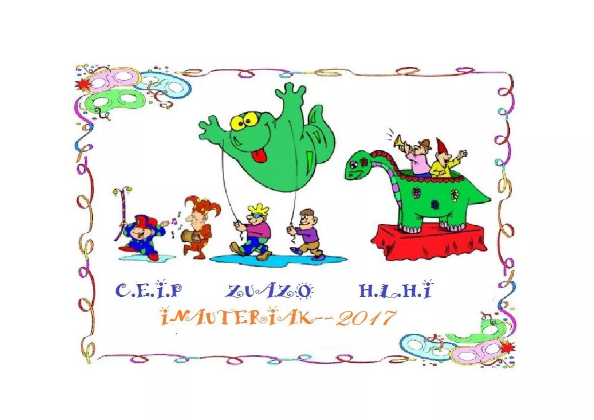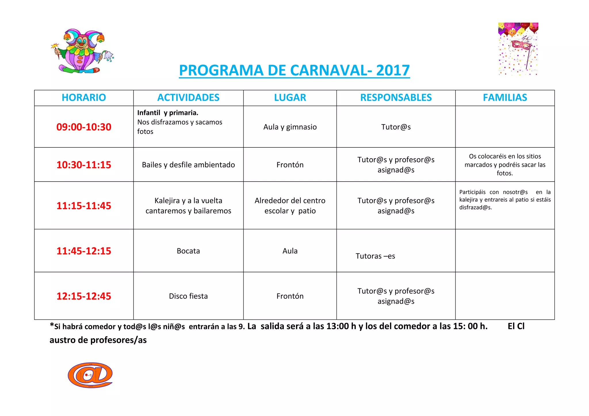 El documento presenta el programa de actividades para el carnaval escolar de 2017. Se detallan las diferentes actividades que tendrán lugar, incluyendo disfraces y fotos por la mañana, bailes y un desfile a continuación, y una kalejira alrededor de la escuela con canciones y bailes a la vuelta. Habrá un bocadillo y disco fiesta para finalizar.